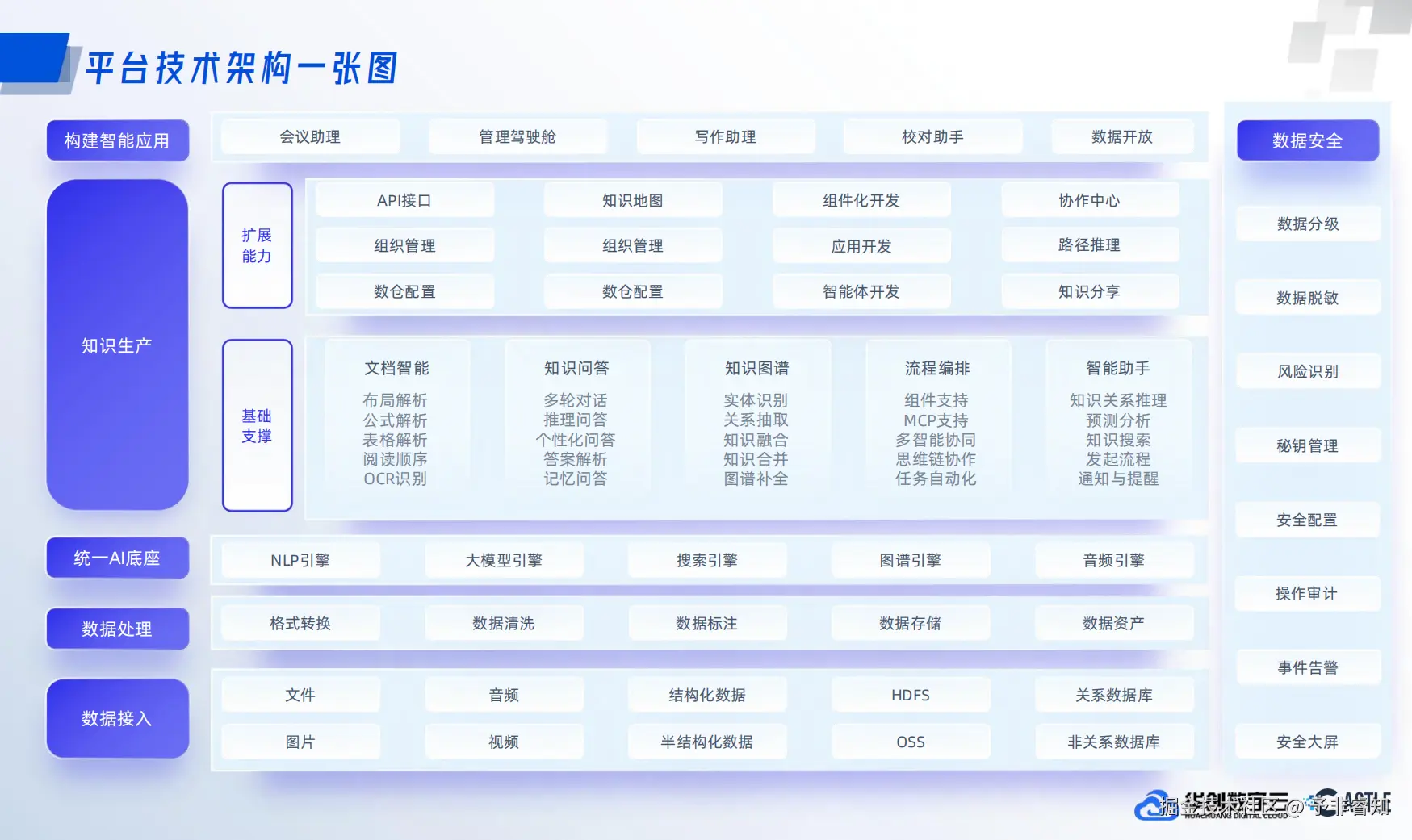 架构的核心是“统一AI底座”,串联数据处理与应用落地,各层功能如下: