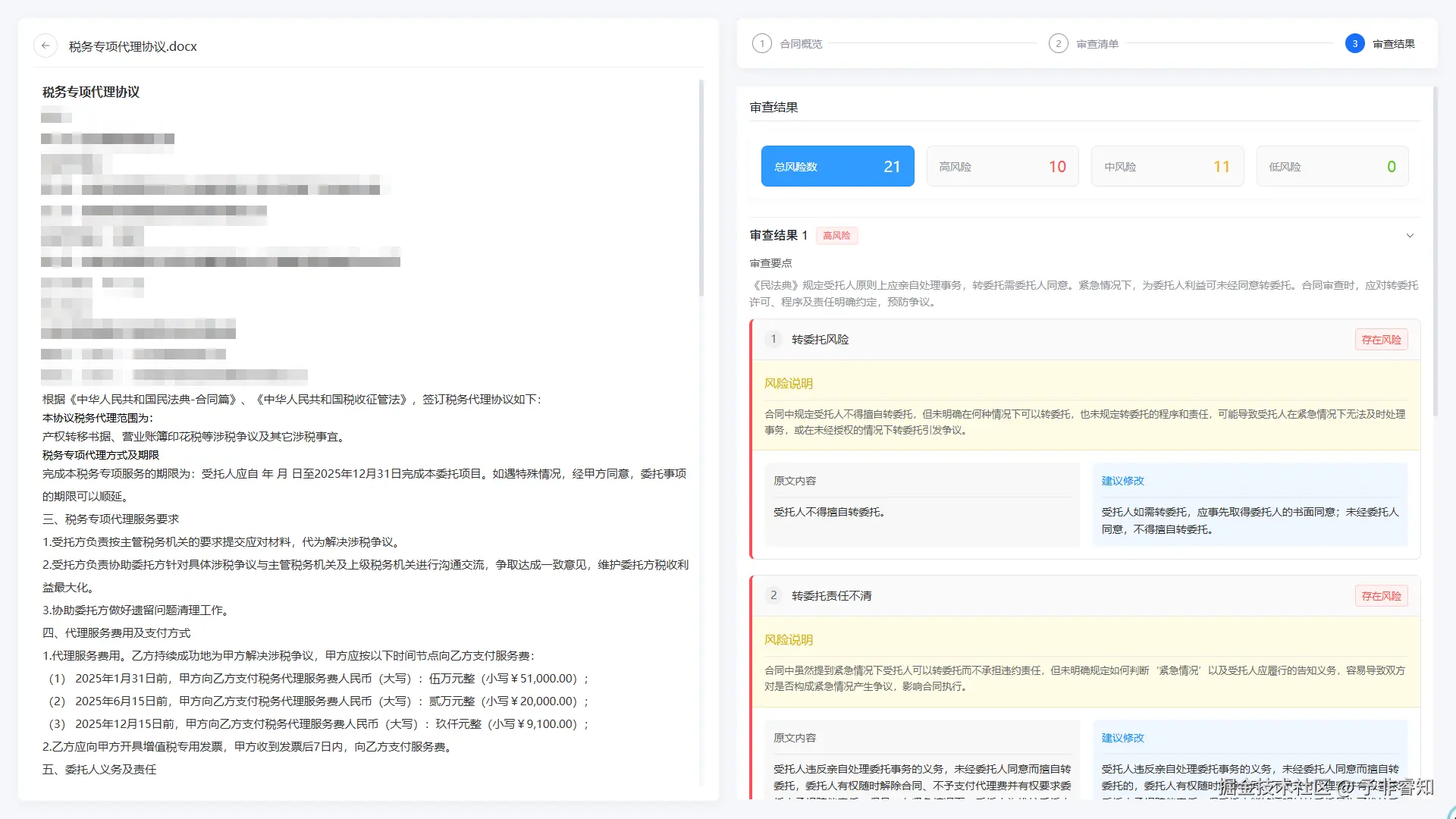 - 条款比对:调用知识图谱引擎,关联企业标准合同模板,标记差异条款;