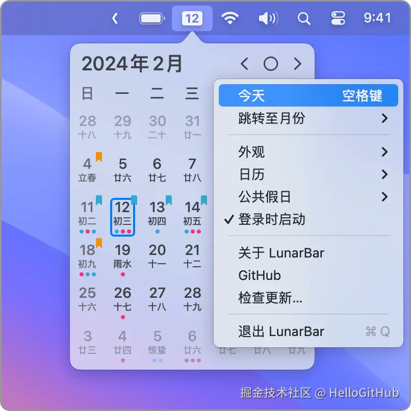 28、LunarBar:极简的 Mac 菜单栏日历。这是一款专为 macOS 设计的菜单栏日历工具,支持农历、节日、节气和提醒等功能。