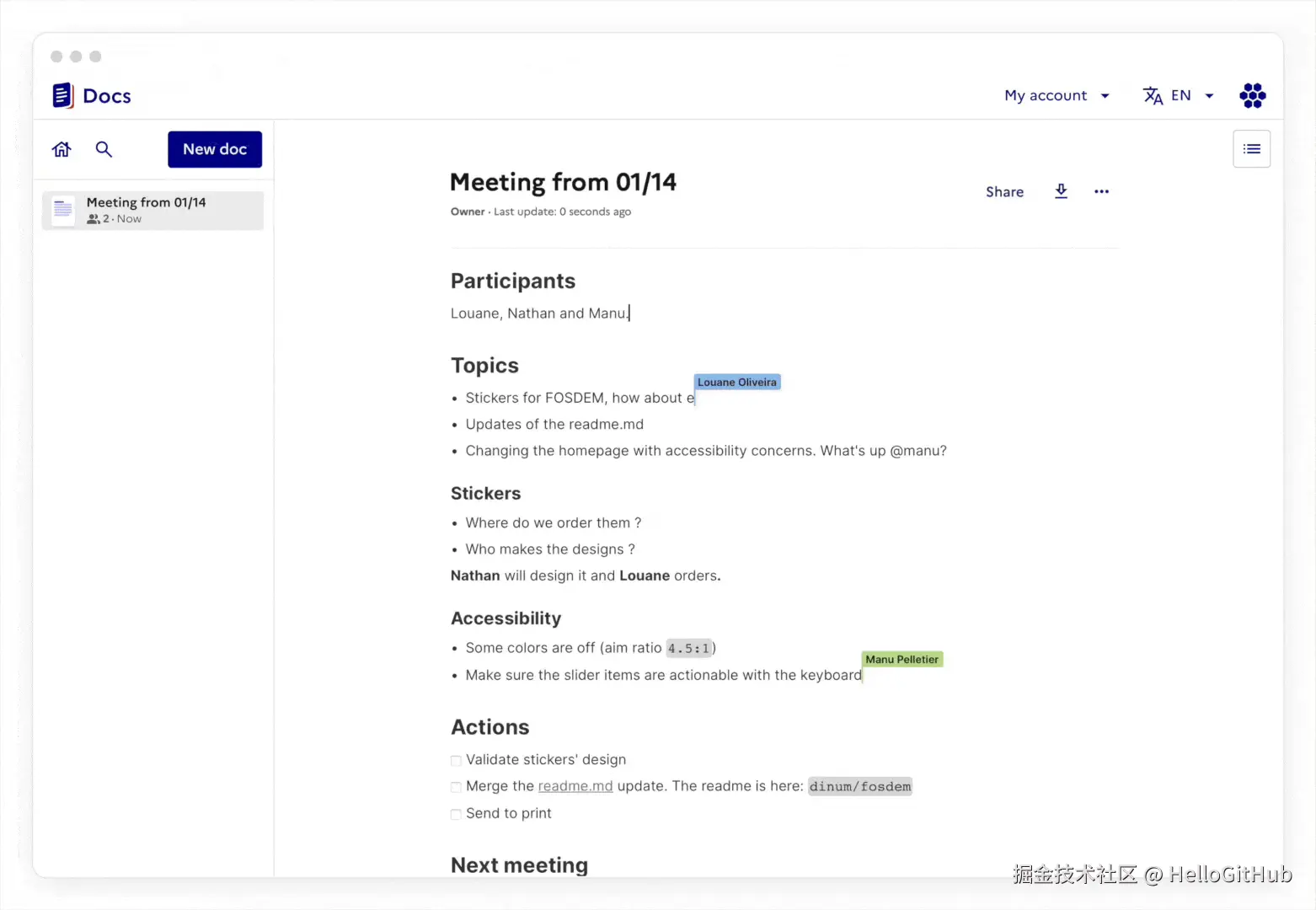 22、docs:开源的实时协作文档平台。这是一款支持多人协作的在线文档平台,完全免费开源。它基于 Django+React 构建,支持离线编辑自动同步、文档/页面级访问控制和 AI 辅助(摘要、翻译、纠错)等功能。