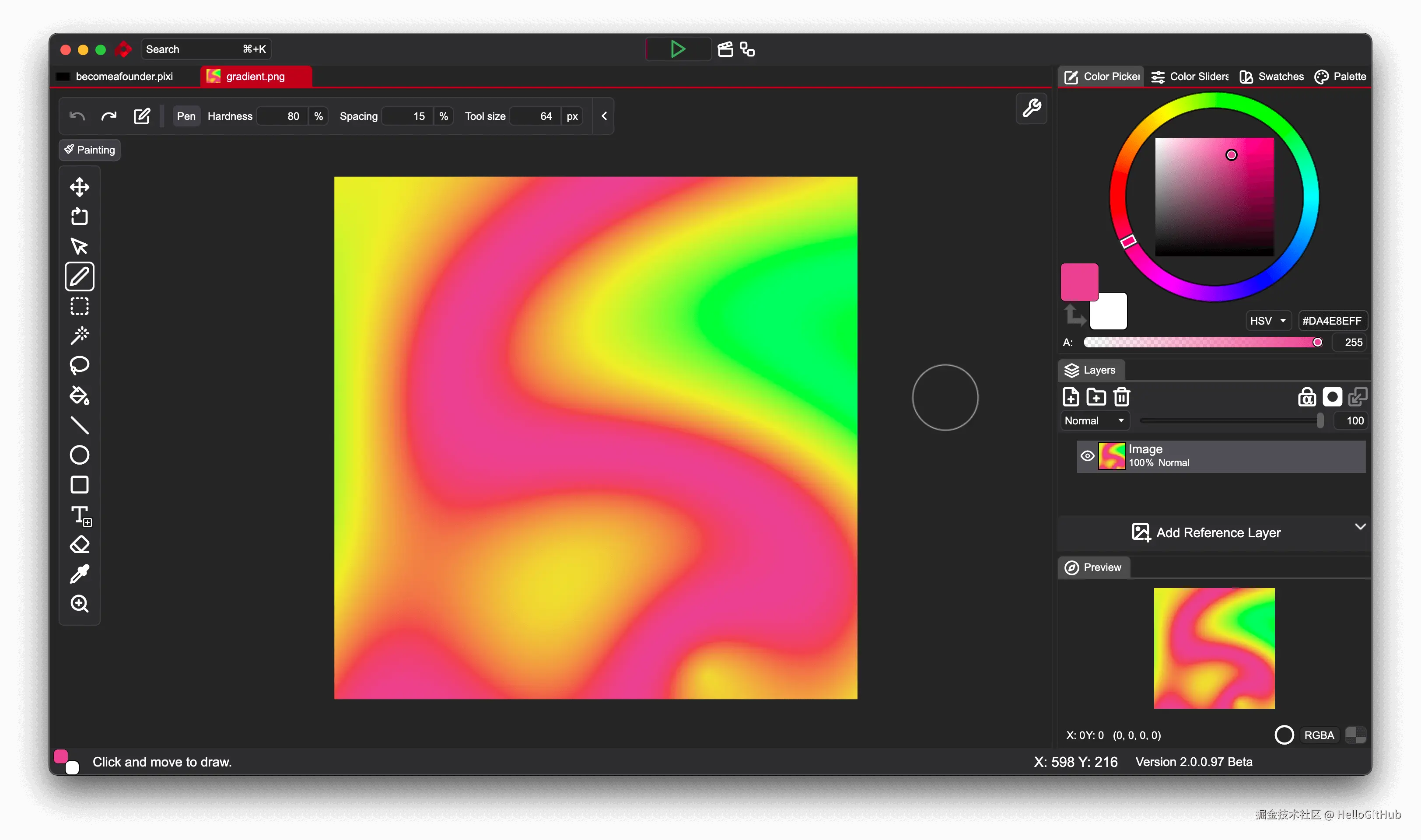 4、PixiEditor:开源的通用 2D 图形编辑工具。这是一款功能丰富的 2D 图像编辑器,集像素画、矢量和绘画工具于一身。支持实时预览、多图层、动画帧和多格式导出等功能,适用于 Windows 平台。