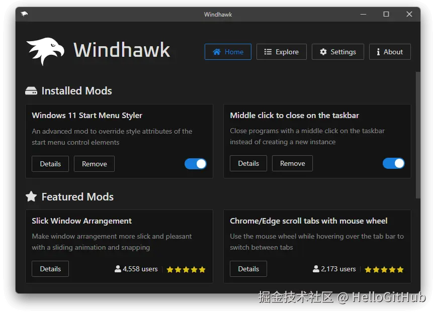 8、windhawk:Windows 应用的自定义与扩展工具。这是一款专为 Windows 平台设计的软件定制与扩展框架,类似 Windows 版的 LSPosed。它通过全局注入和 Hook 技术,将原本需要手动修改二进制或注册表才能实现的界面与功能调整,做成可一键安装的 mod(插件)。用户可以像安装插件一样,轻松获取、安装和管理各种 mod,实现自定义目标程序的界面、功能和交互方式。来自 @Flashlightning 的分享