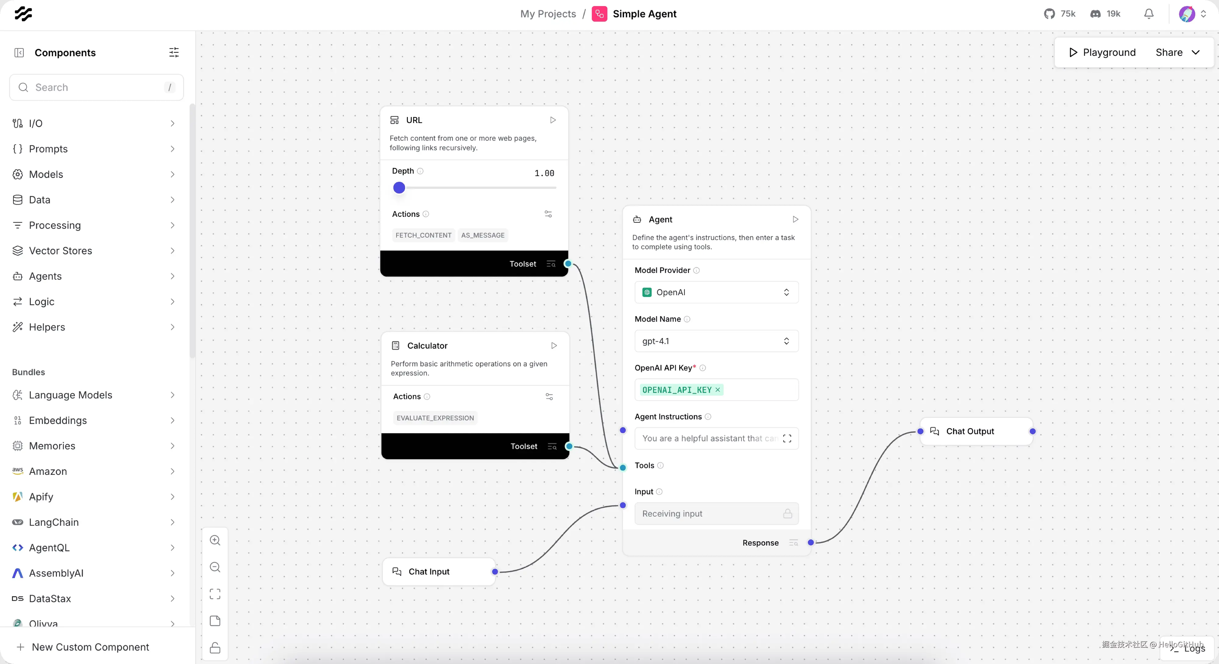 32、langflow:可视化 AI 工作流构建平台。这是一款面向开发者和企业用户的开源 AI 智能体与工作流构建平台。它将 LangChain 的核心能力(链、工具、记忆、向量存储等)封装成可复用组件,并结合 React Flow 实现可视化流程编辑,用户无需编写代码即可快速设计、调试并部署复杂的 AI 工作流。来自 @大痴小乙 的分享