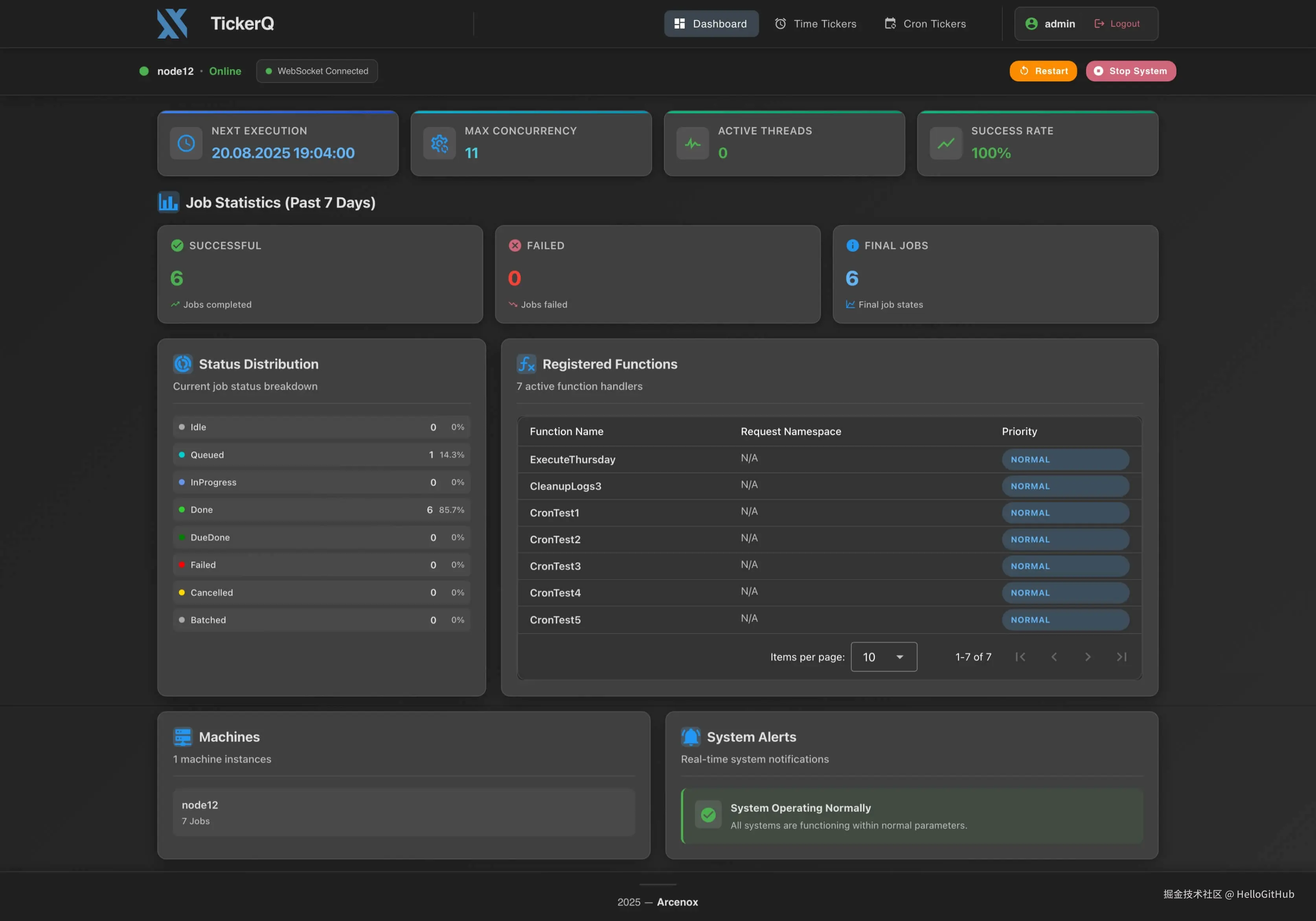 5、TickerQ:零反射的 .NET 任务调度库。这是一款专为 .NET 设计的后台任务调度库,在编译期自动生成相关代码,启动快、省内存。它内置实时 Web 面板,可随时查看、触发或取消任务,支持 Cron 表达式、定时调度、限流和重试策略等功能。