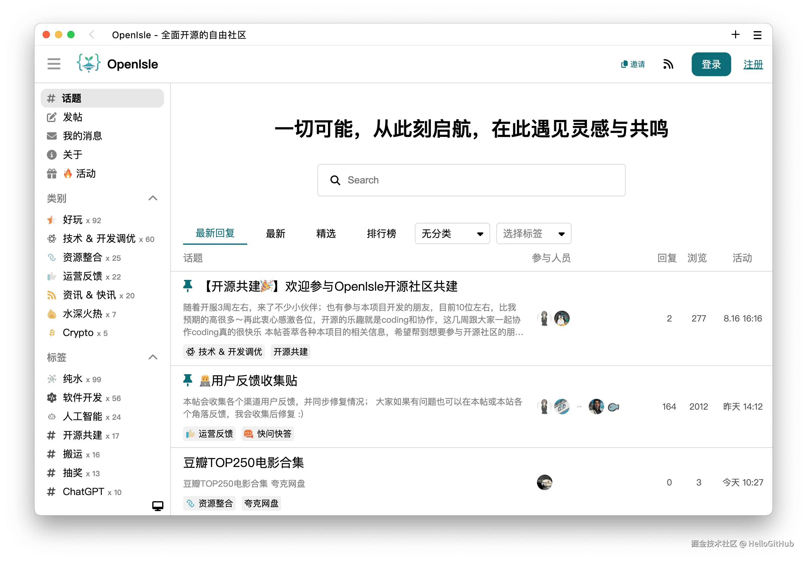 14、OpenIsle:Java 开发的轻量级开源社区系统。这是一个基于 Spring Boot 和 Vue3 构建的开源自由社区系统,定位为轻量级的 Discourse。它完全开源、可二次开发,支持白名单邀请、自定义标签、实时通知等功能。来自 @7NzpEK 的分享