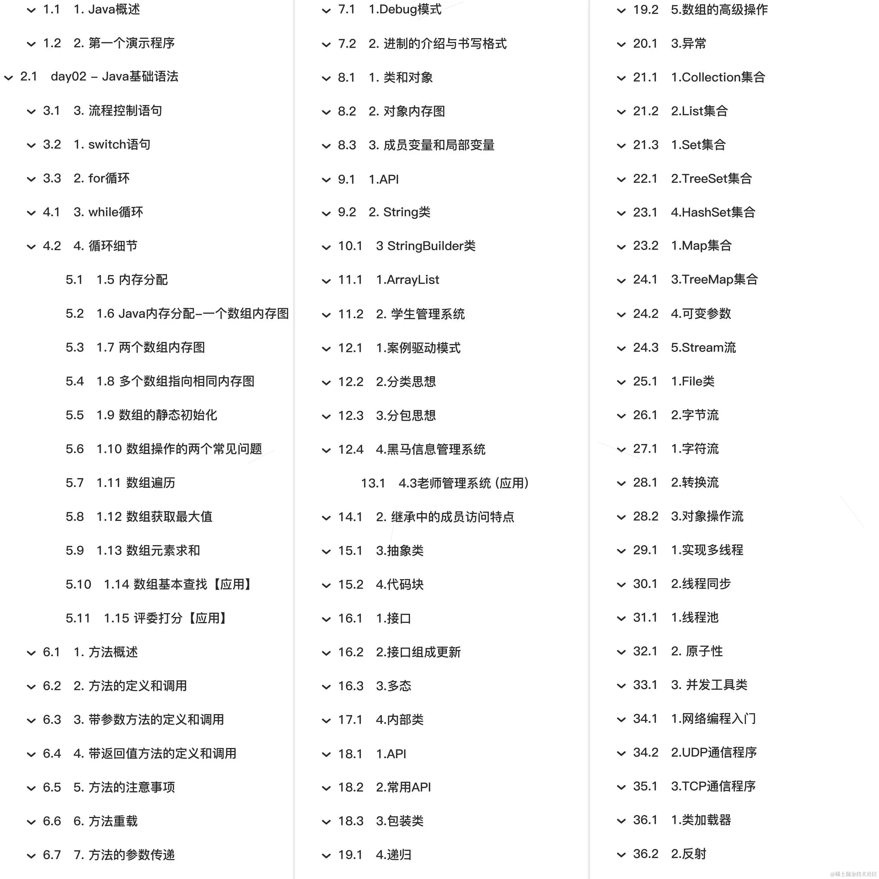 🏆🏆🏆教程全知识点简介:1. Java概述 2. 第一个演示程序 day02 - Java基础语法 1 类型转换 2. 运算符 3. 流程控制语句 1. switch语句 2. for循环 3. while循环 4. 循环细节 2. 方法的定义和调用 5. 方法的注意事项 6. 方法重载 7. 方法的参数传递 1.Debug模式 2. 进制的介绍与书写格式 1. 类和对象 2. 对象内存图 3. 成员变量和局部变量 1.API 2. String类 3 StringBuilder类 1.ArrayList 2. 学生管理系统 1.案例驱动模式 2.分类思想 4.黑马信息管理系统 2. 继承中的成员访问特点 3.抽象类 4.代码块 1.接口 2.接口组成更新 3.多态 4.内部类 4.递归 5.数组的高级操作 3.异常 1.Collection集合 2.List集合 1.Set集合 3.TreeMap集合 4.可变参数 5.Stream流 1.File类 2.字节流 3.对象操作流 1.实现多线程 2.线程同步 1.线程池 2. 原子性 3. 并发工具类 1.网络编程入门 2.UDP通信程序 1.类加载器 2.反射 1.xml 2.枚举