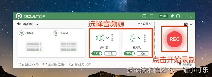 步骤2:接下来可以自由选择需要录制的音频源,如果需要录制内部声音,就选择扬声器录制;需要录制外部声音就选择麦克风录制。也可以两者都选。接下来可以根据需要调整麦克风和扬声器音量,开启麦克风增强与降噪功能,以获得更清晰的音质。设置完毕后点击 “REC” 按钮,软件将实时显示录音时长。