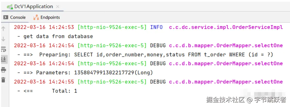 在上面的例子中,设置Caffeine的过期时间为60秒,而Redis的过期时间为120秒,下面进行测试,首先看第一次接口调用时,进行了数据库的查询:编辑