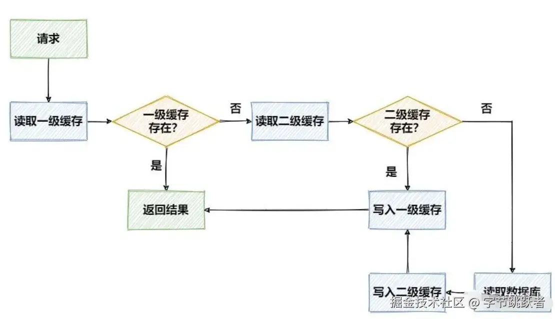 在先不考虑并发等复杂问题的情况下,两级缓存的访问流程可以用下面这张图来表示:编辑