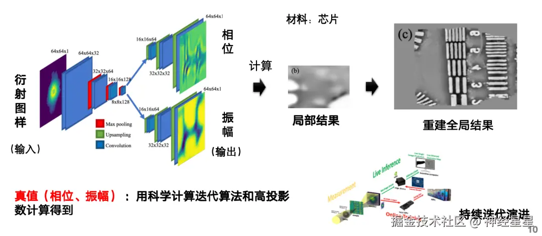 又比如,叠层成像快速重建 AI 数据集能够完成输入衍射图样,预测相位和振幅,计算得到重建图像的 AI 任务,完成重建图像过程中涉及到的大量计算。该架构中包含 2 个分支,分别预测相位和振幅,其真值通过科学计算迭代算法和高投影数计算得到。