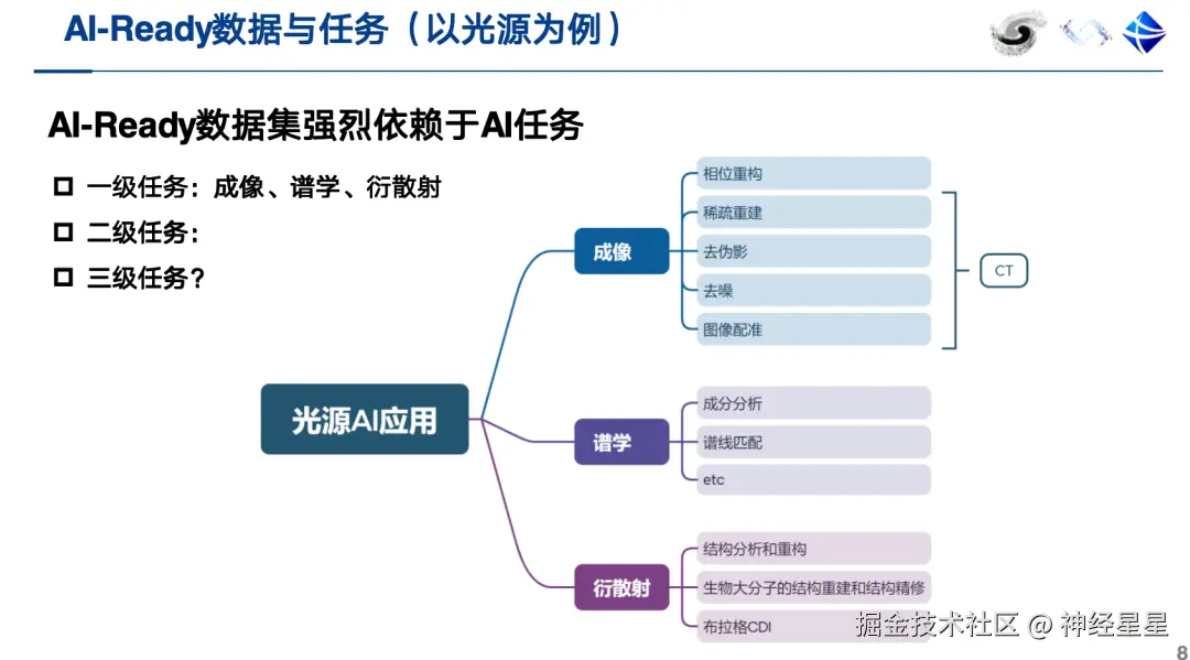 目前,一个合格的 AI-Ready 数据集除包含本体数据与标注数据之外,还应提供元数据,其中包括对 AI 任务的描述等信息。更重要的是,AI-Ready 数据集需与有价值的 AI 任务直接关联。 以光源为例,其 AI 应用应能够有效支持成像、谱学、衍散射等具体科学任务。