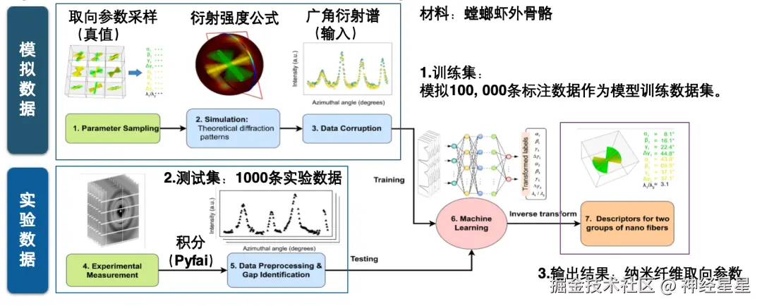 接下来我用 2 个例子来说明什么样的数据集是 AI-Ready 的数据集。例如纳米纤维取向预测 AI 数据集,它有明确的 AI 任务,即在输入广角衍射谱后直接预测纳米纤维的取向参数。构建这样一个数据集,需要模拟数据和实验数据共同作用。