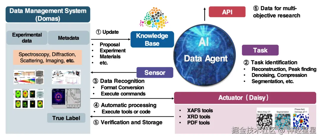 我们团队做的数据智能体主要应用于光源(HEPS)/中子源(CSNS)场景,支持数据的加工和供给。智能体的上游是 Domas 数据管理系统(Data Management System),Domas 的上游是大数据装置的采集系统,采集系统上游是探测器本身。