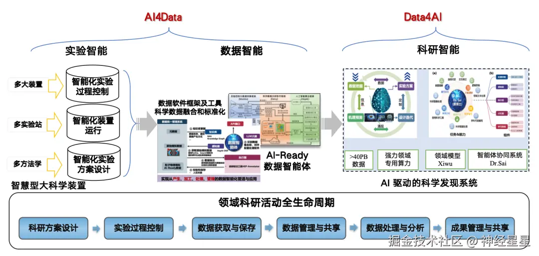 之所以把智能体技术用于数据处理方面,是因为 AI4S 已经逐渐成为发展趋势。 AI 有助于高能物理的研究发现,但是对数据有要求 ,因此我们采用了「AI4Data」到「Data4AI」的策略,利用 AI 将原始数据转化为 AI-Ready 的形式,以促进成果研发,构建 AI 驱动的科学发现系统。