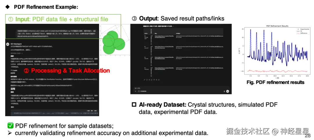 目前,该智能体已经可以用于构建跨装置的 X 射线衍射和中子粉末衍射实验和模拟的 AI 数据集、构建对分布函数(PDF)的实验-仿真融合数据集。