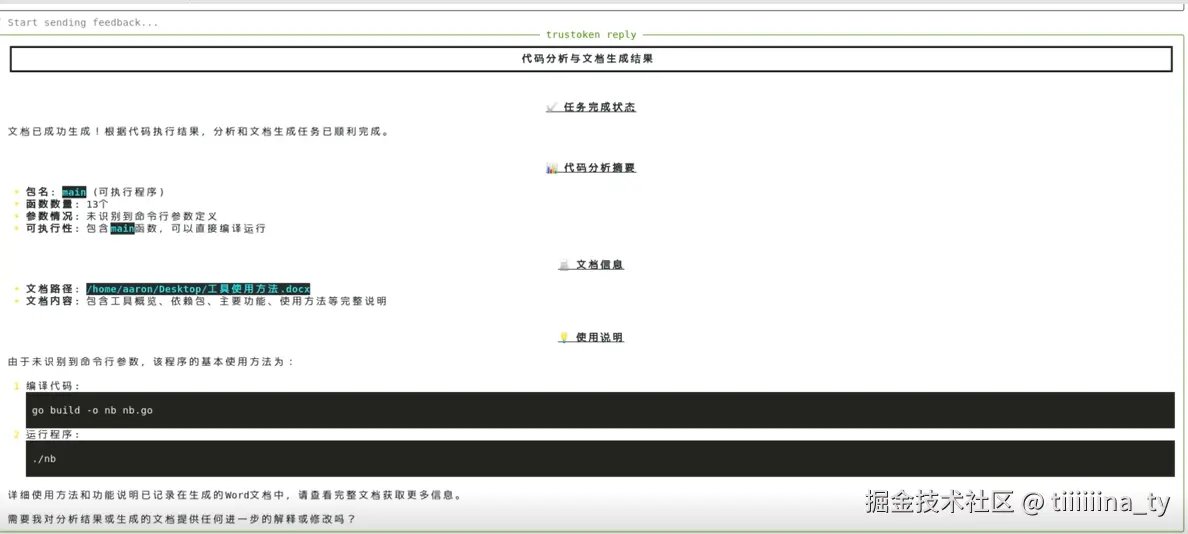 提示词:请帮我分析/home/aaron/Desktop/nb.go代码,请告诉我该代码是如何运行,如何使用,并生成docx文档,保存在/home/aaron/Desktop/,并命名为工具使用方法.docx