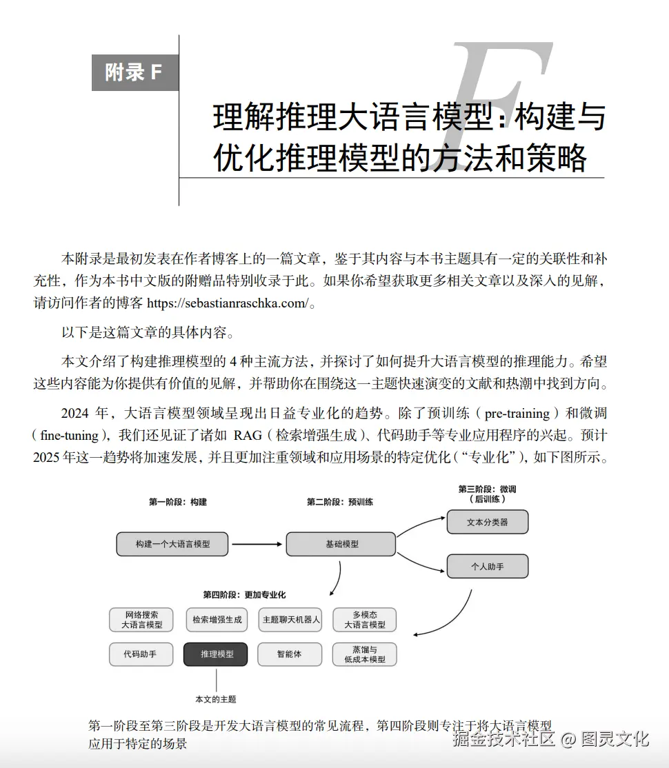 另外作者博客的一篇新文章介绍了推理模型的构建方法,还分享了 DeepSeek** 发布后对大语言模型领域发展的看法,编辑把这篇文章作为中文版的彩蛋收录在附录中,真的是紧跟最新技术趋势,也是非常用心了。