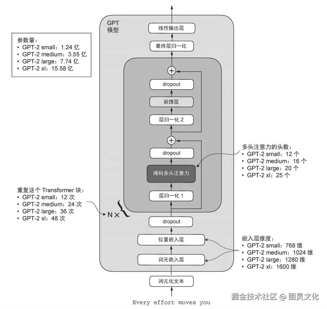 不同大小的 GPT-2 大语言模型的参数量从 1.24 亿到 15.58 亿不等。核心架构相同,唯一的区别是嵌入层大小以及诸如注意力头、Transformer 块等个别组件的重复次数