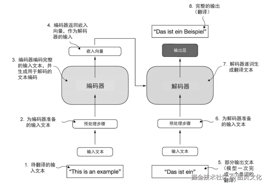 原始 Transformer 架构的简化描述,这是一种用于机器翻译的深度学习模型。Transformer 由两部分组成:一个是编码器,用于处理输入文本并生成文本嵌入(一种能够在不同维 度中捕获许多不同因素的数值表示);另一个是解码器,用于使用这些文本嵌入逐词生 成翻译后的文本。请注意,图中展示的是翻译过程的最后阶段,此时解码器根据原始输 入文本(“This is an example”)和部分翻译的句子(“Das ist ein”),生成最后一个单词 (“Beispiel”)以完成翻译