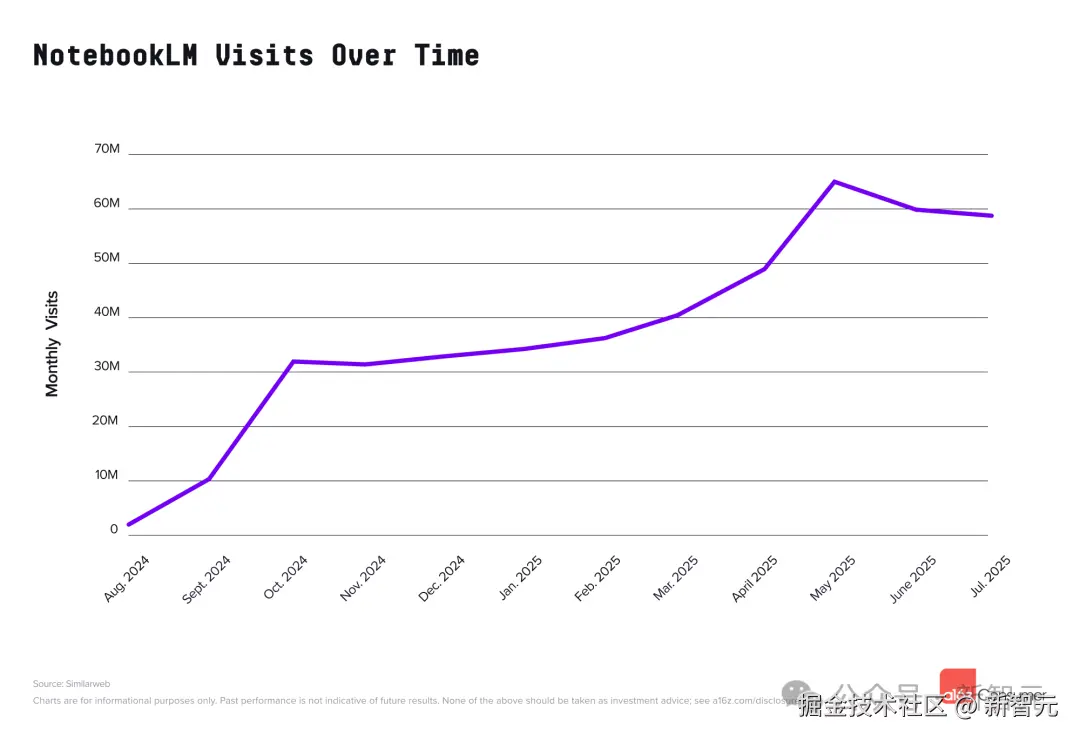 NotebookLM 在近一年前首次爆红,此后稳步增长,仅在夏季有轻微下滑(可能源于学术用户的暂时性流失)。