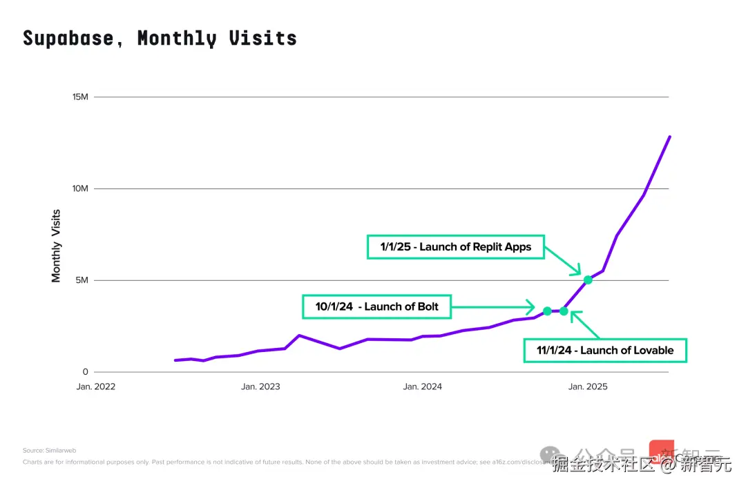 Supabase 的流量增长与核心「氛围编程」平台的崛起几乎亦步亦趋,在过去九个月里的增速远超往年。