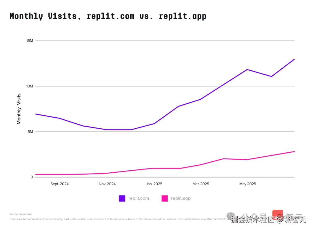 这些平台也在为其他 AI 产品引流。通过 Replit 和 Lovable 构建并发布的网站(未使用自定义域名),其流量分别归于replit.app和lovable.app之下。