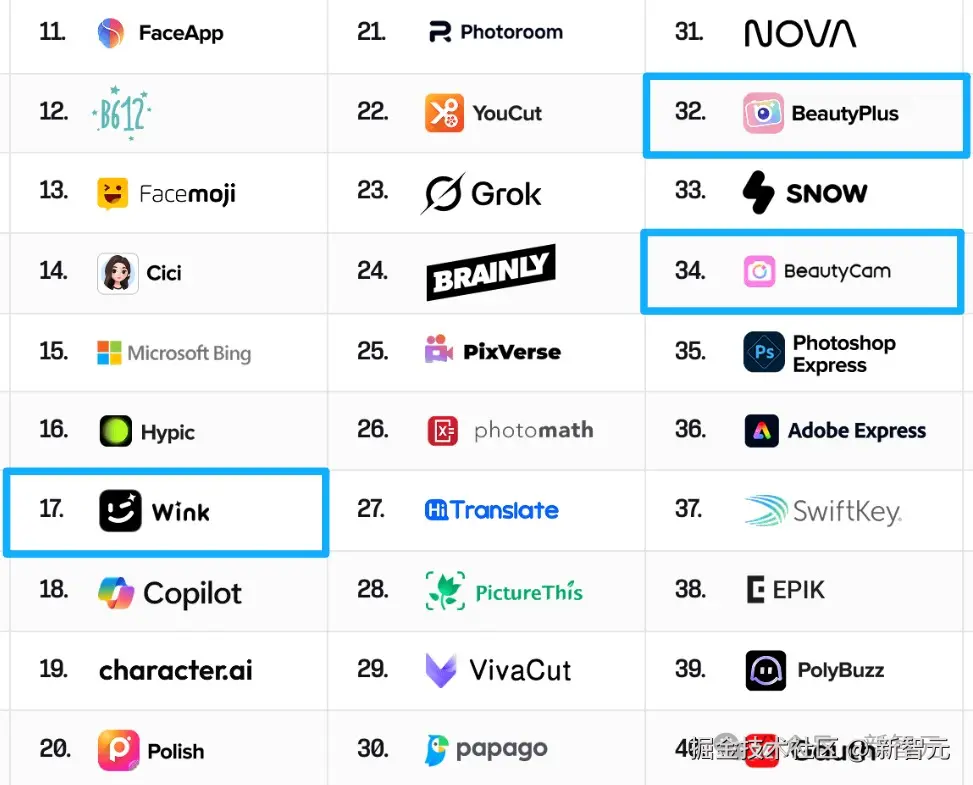 照片和视频类别的集中度尤其高,仅美图一家就贡献了五个席位:Photo&VideoEditor、BeautyPlus、BeautyCam、Wink 和 Airbrush。