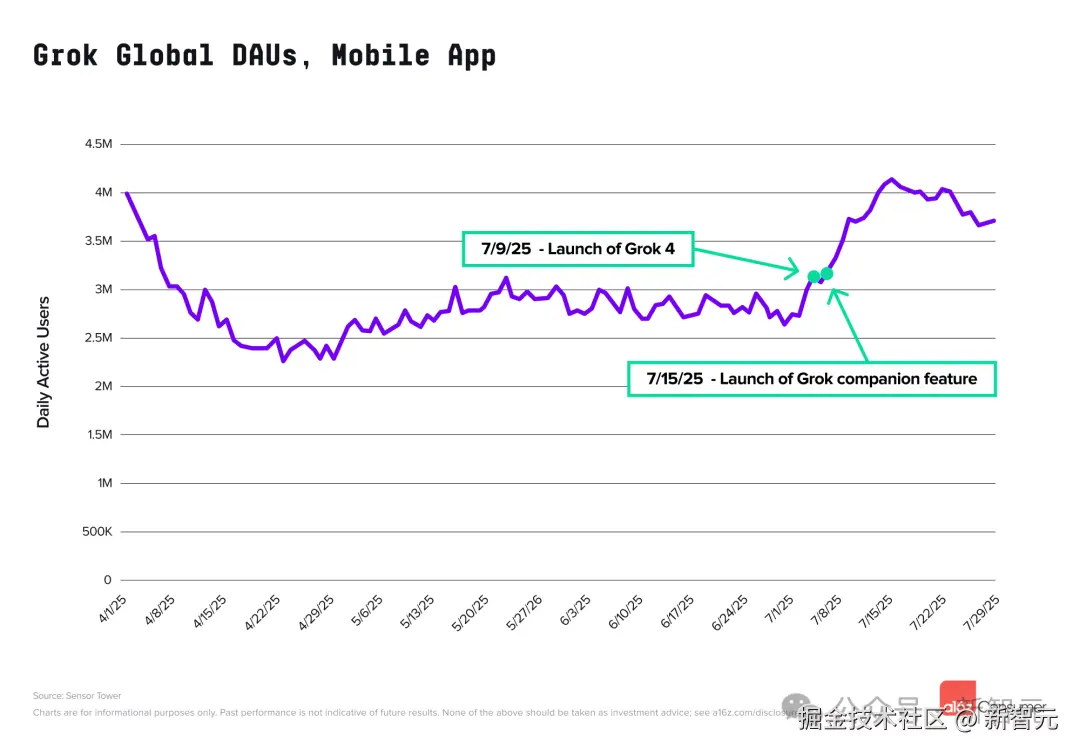 2025 年 7 月,Grok 的移动端用量迎来巨大增长,随着 7 月 9 日新模型 Grok4(具备更强的推理能力、实时搜索和工具集成)的发布,用量攀升了近 40%。