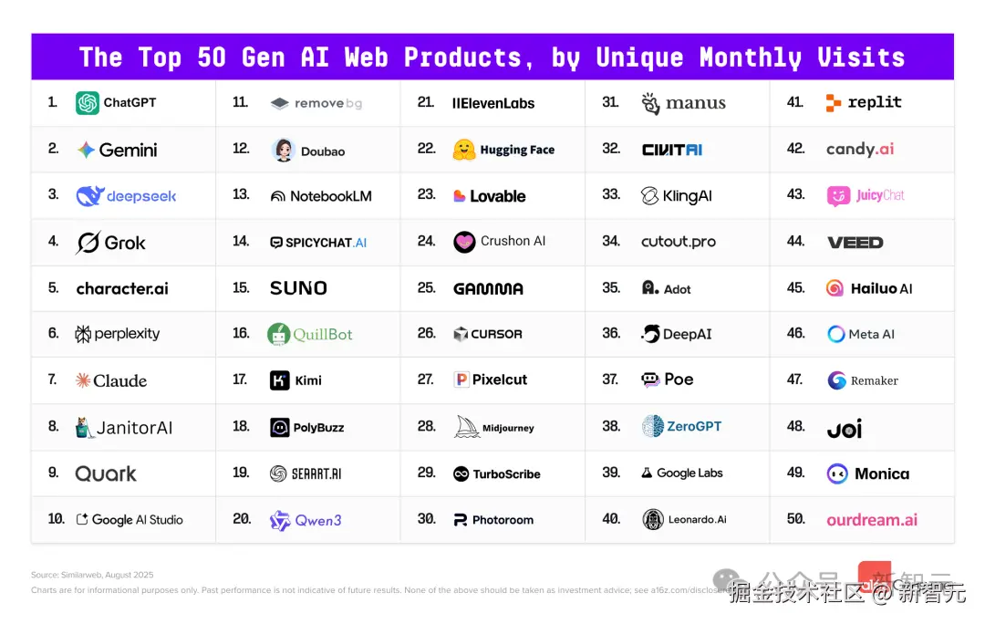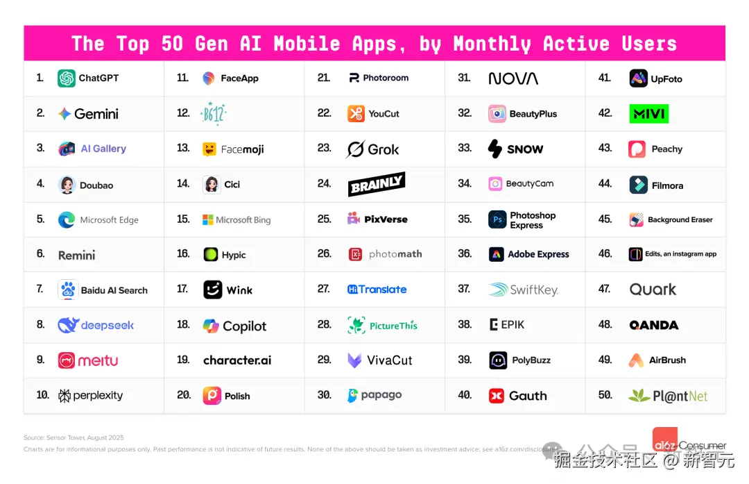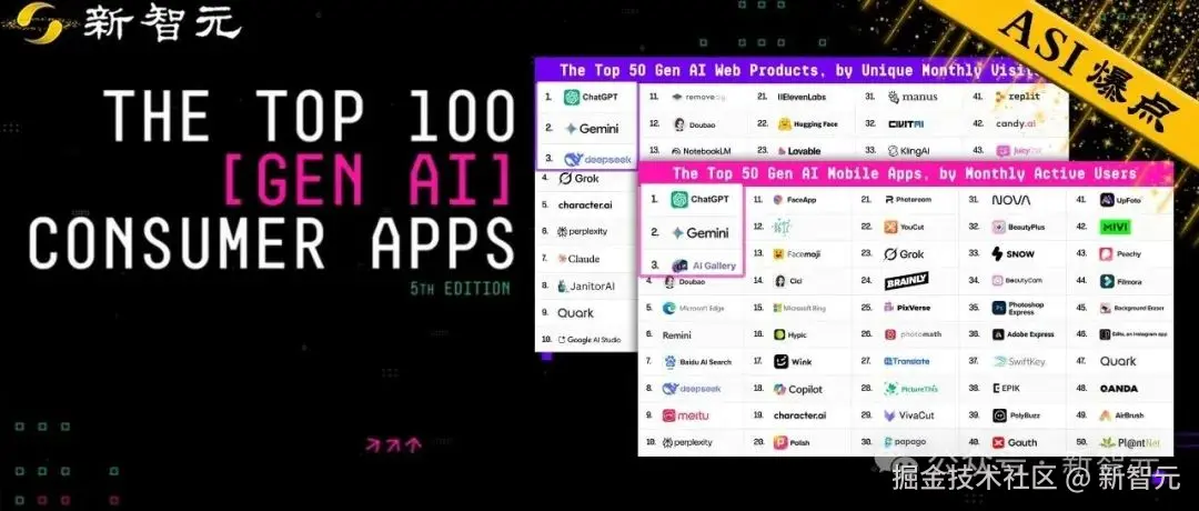 「【新智元导读】a16z 最新发布「全球 Top100 消费级 GenAI 应用榜单」,AI 竞争格局逐渐稳定,中国力量全面崛起,DeepSeek、豆包、夸克等多款产品跻身前十。ChatGPT 依旧领跑,谷歌 Gemini 紧随其后,Grok 高速逆袭。整体来看,全球 AI 正进入多极化竞争的新阶段。」