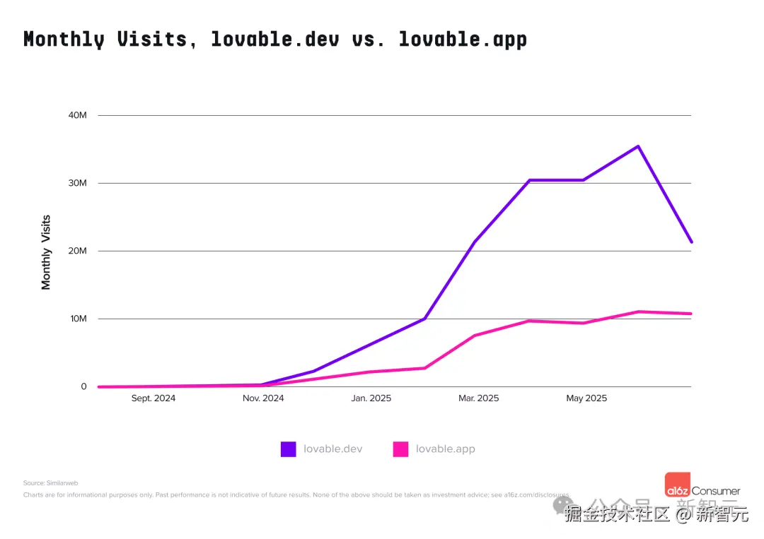 这两个域名本身都有着可观的流量(lovable.app的流量足以排进榜单前 50),但仍低于其面向开发者的主站。