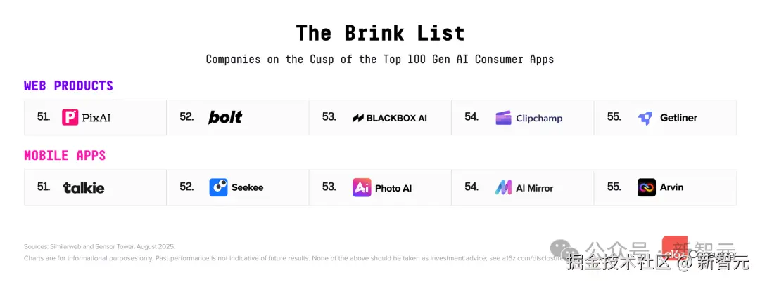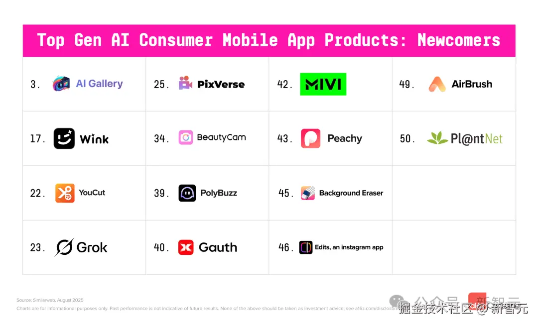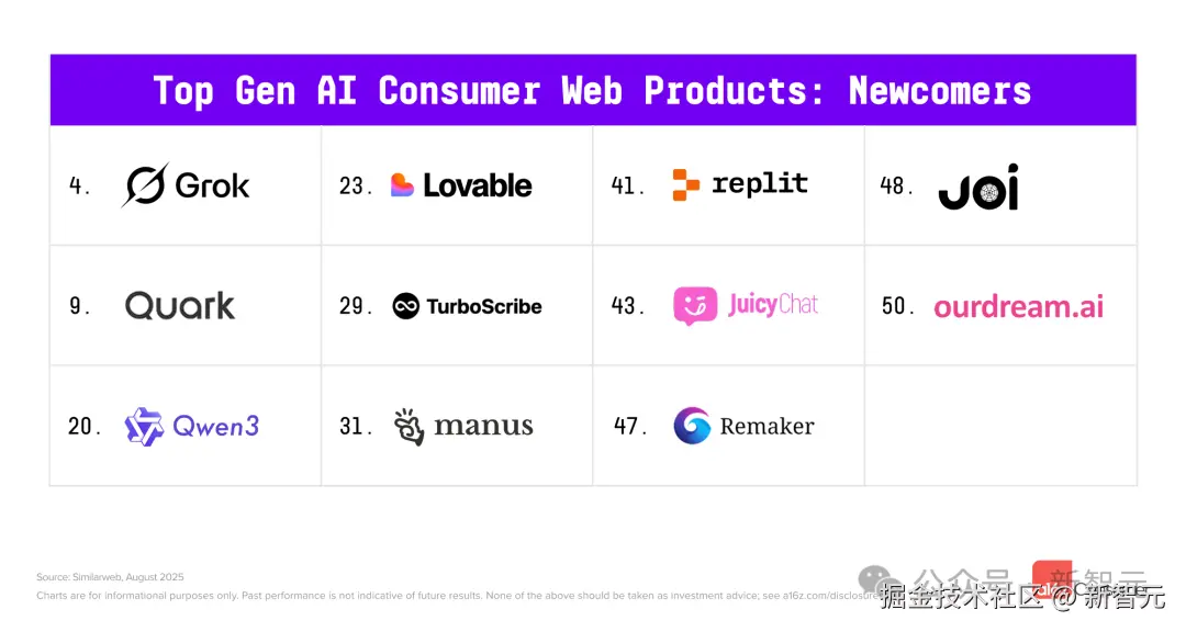 相比之下,在 a16z 2025 年 3 月的榜单中,新晋者达 17 个。