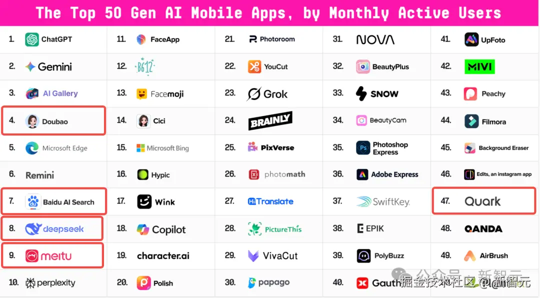 豆包拿下全球第四、百度 AI 搜索全球第七、DeepSeek 全球第八、美图全球第九,以及夸克上榜第四十七。