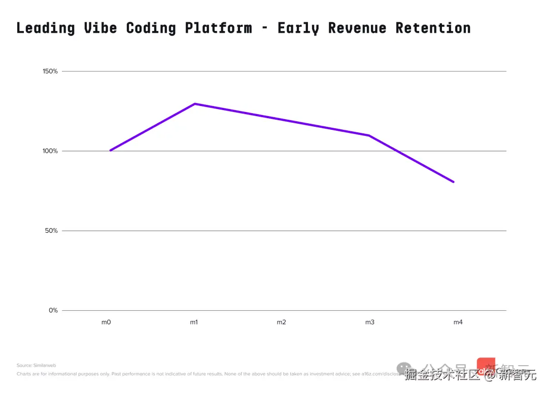 来自信用卡数据提供商 ConsumerEdge 的数据显示,某顶级「氛围编程」平台的美国用户群体,在注册数月后,其收入留存率超过了 100%。