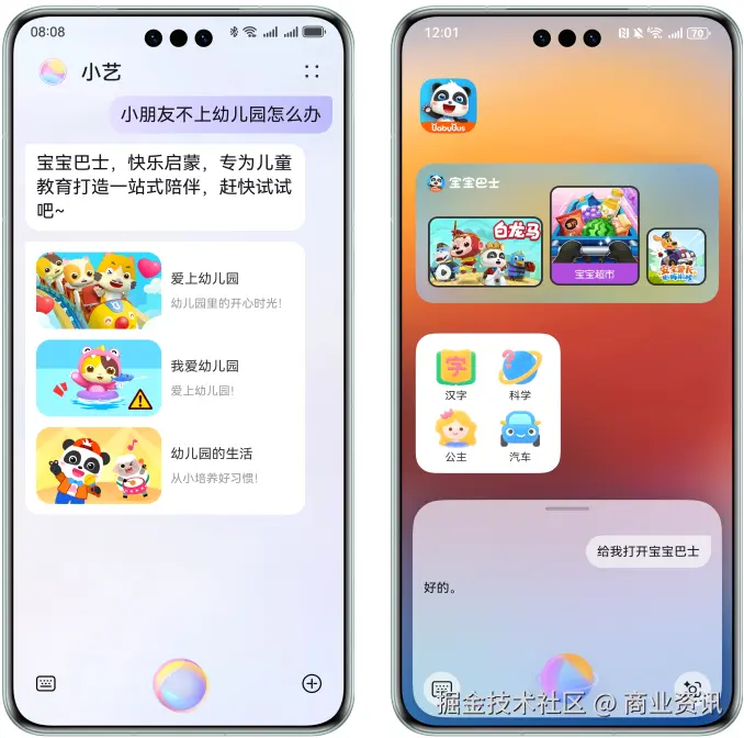 基于 HarmonyOS 的意图框架及 AI 大模型能力,教育类应用可在日常使用时更智能地响应用户需求。如在洪恩识字 App 中,结合用户日常使用习惯,小艺建议可定期、定时推送“待学字”的相关课程,帮助用户轻松完成学习规划;如在宝宝巴士 App 中,用户可以通过小艺推荐、呼唤小艺语音唤醒等方式,快速直达需求功能页,省去层层跳转步骤。