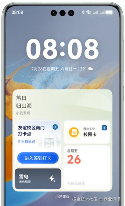 在高校类应用及元服务中,基于用户 POI 位置,结合小艺建议的服务推荐能力,在用户到达学园校区、食堂/餐厅等地点时,桌面还将主动推荐定位打卡、校园卡付款码等服务功能,为常用服务提供系统级桌面入口,简化用户操作流程。据了解,当前包括北京大学、西北工业大学在内的诸多院校已接入 POI 相关能力,与 HarmonyOS 一起,探索高校类应用的数智场景边界。