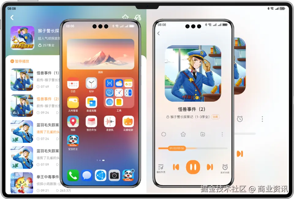 如宝宝巴士 App,基于 HarmonyOS“一次开发,多端部署”的特性,开发者在多端多设备上的开发效率有效提升,同时降低了开发成本,并支持应用跨设备的接续。当用户外出返家后,原本通过手机端收听的节目可在平板端接续播放,实现鸿蒙生态内多设备形态的无缝部署和一致体验。