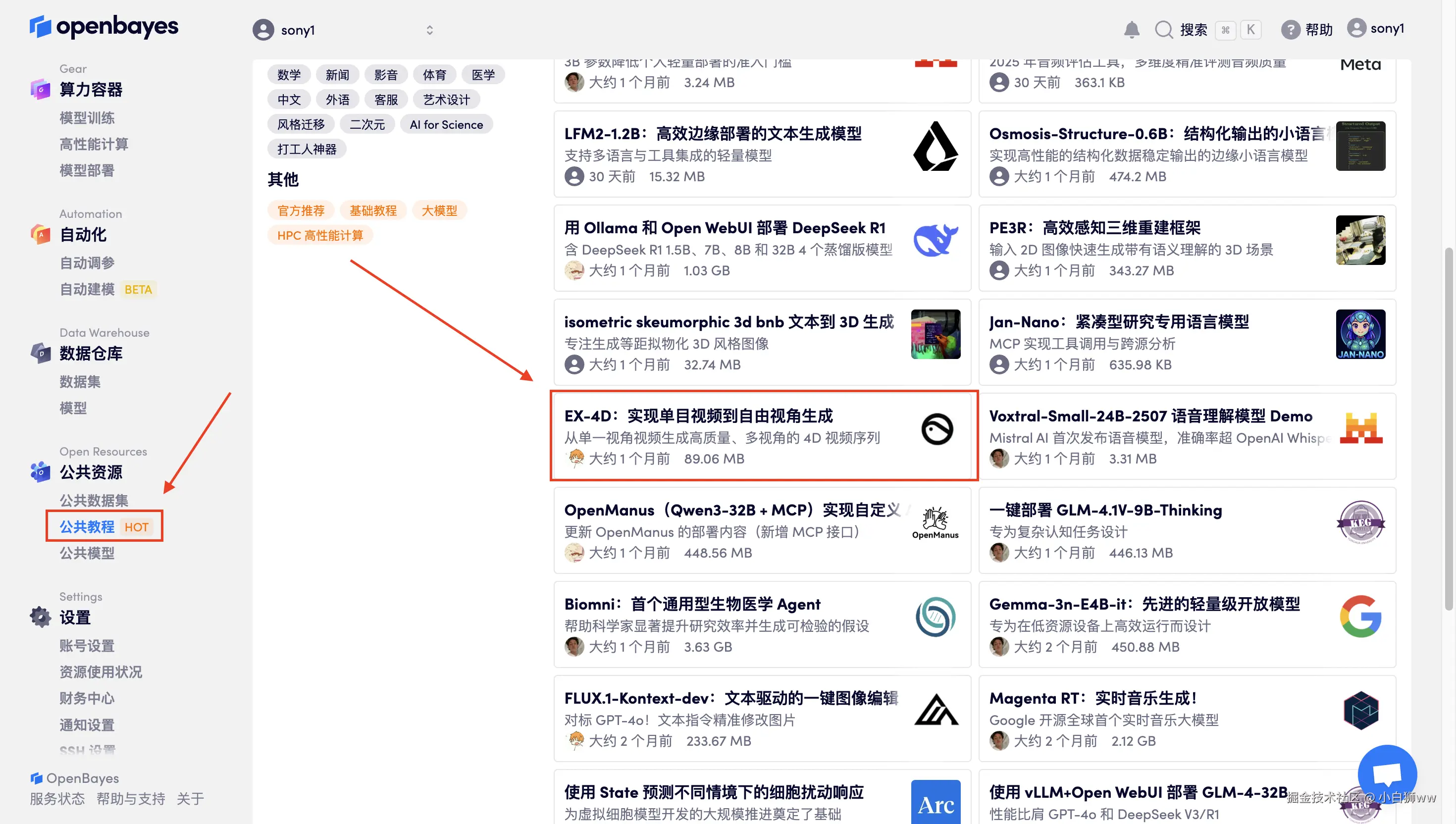 首先点击「公共教程」,在公共教程中找到「EX-4D:实现单目视频到自由视角生成」,单击打开。