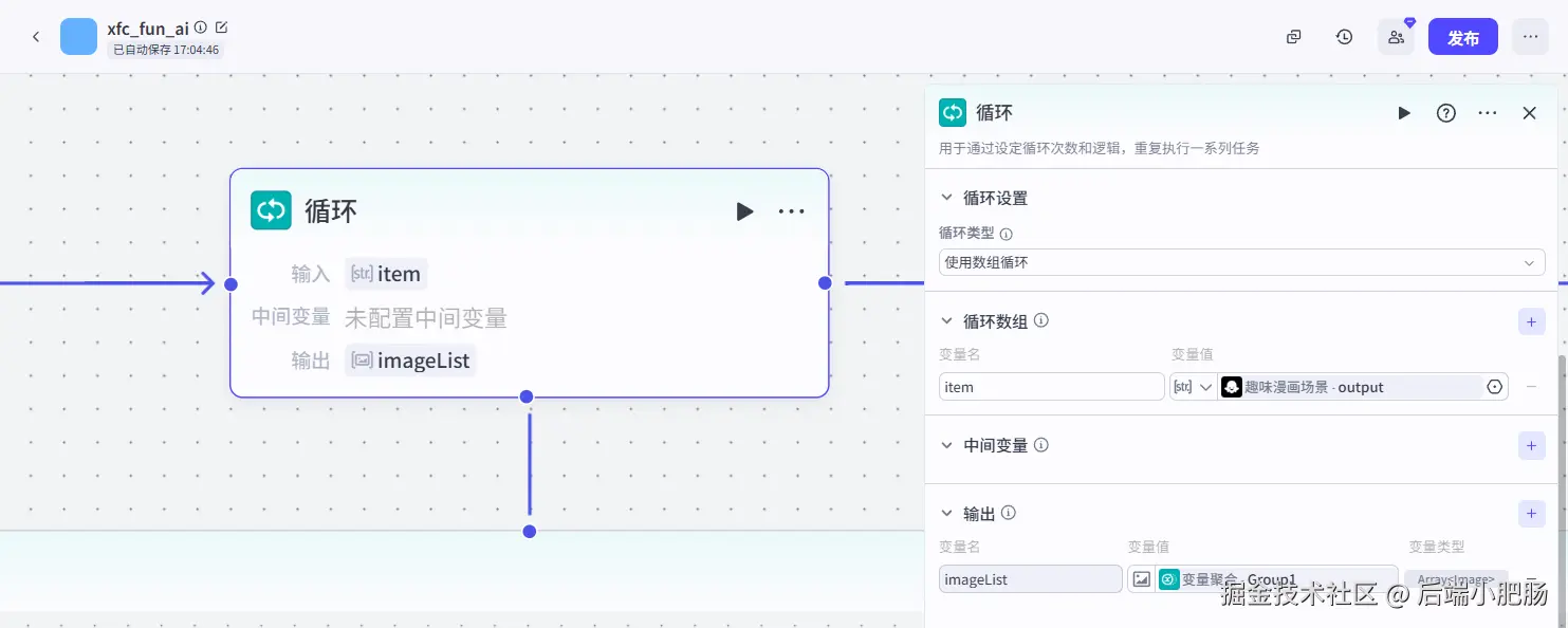 循环: 基于趣味漫画场景( 大模型 ) 会生成场景列表,需要基于循环来处理这个场景列表,在循环中对每个场景进行文生图,图像生成和漫画生成操作。