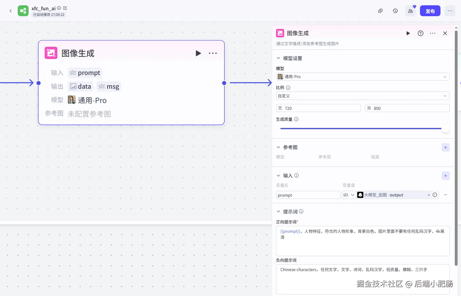 图像生成: 这个节点的作用是基于前面大模型 配图节点生成的文生图提示词来生成图片。