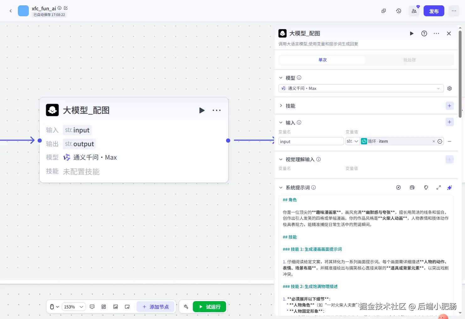大模型 配图: 这个节点的作用是产生文生图提示词,我定义的风格是火柴人画风,这个网上提示词样例很多,我就不贴了,要注意的一点就是保持人物一致性,在文生图提示词中需要加入妻子和丈夫的外形描述。