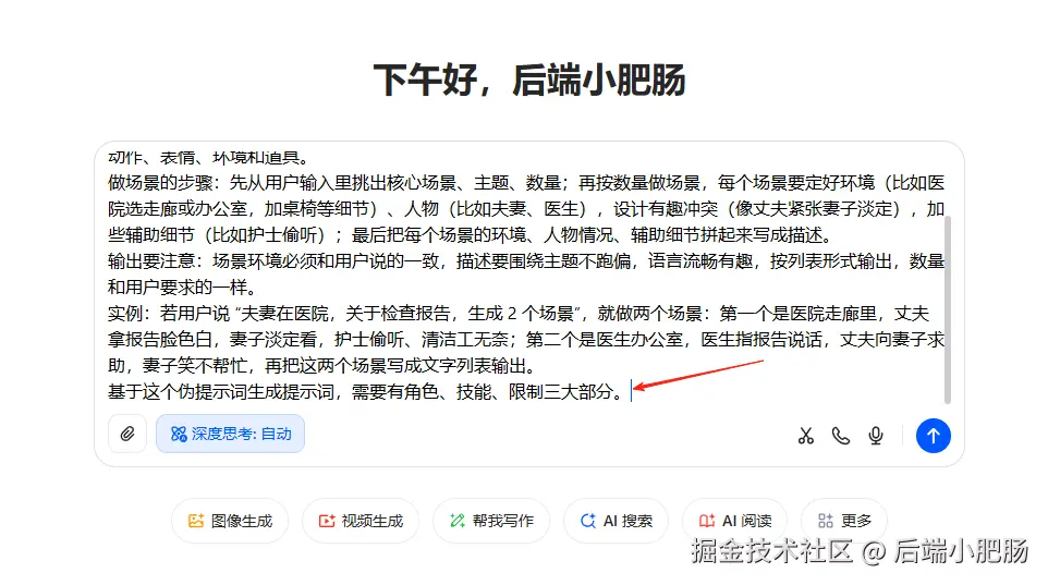 实例:若用户说 “夫妻在医院,关于检查报告,生成 2 个场景”,就做两个场景:第一个是医院走廊里,丈夫拿报告脸色白,妻子淡定看,护士偷听、清洁工无奈;第二个是医生办公室,医生指报告说话,丈夫向妻子求助,妻子笑不帮忙,再把这两个场景写成文字列表输出。