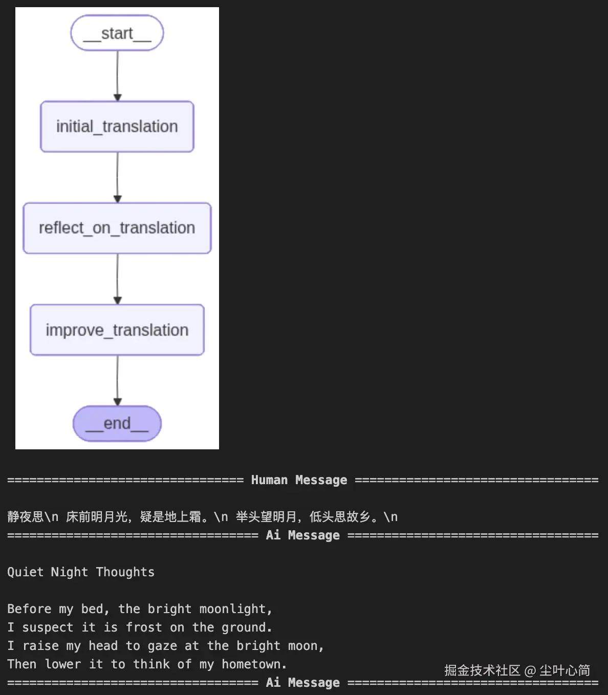 initial_translation(初步翻译),reflect_on_translation(反思翻译),improve_translation(改进翻译)。 我使用State来保存每一步的翻译历史,整个工作流按顺序执行这三个节点,确保翻译从初始到优化都能不断改进。