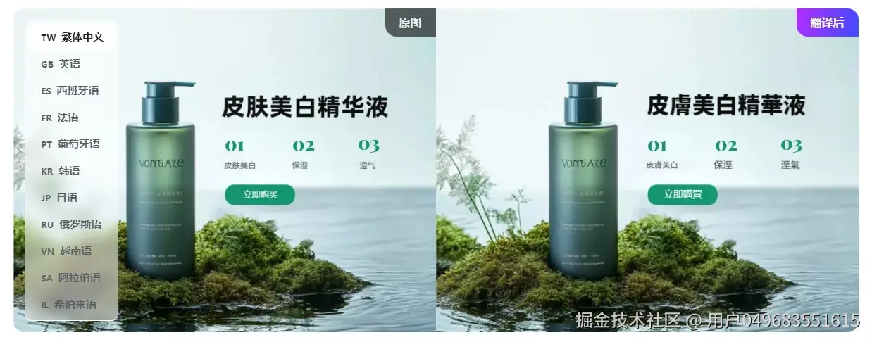 风车AI翻译提供了一站式的AI处理服务,无论是视频、图片还是文字,都能轻松应对。特别是图片翻译功能,它支持任何背景的商品图、模特照等,一键翻译成新的语言,而且不会破坏原图。