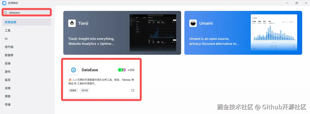 - 在搜索框中搜索 DataEase,找到应用。