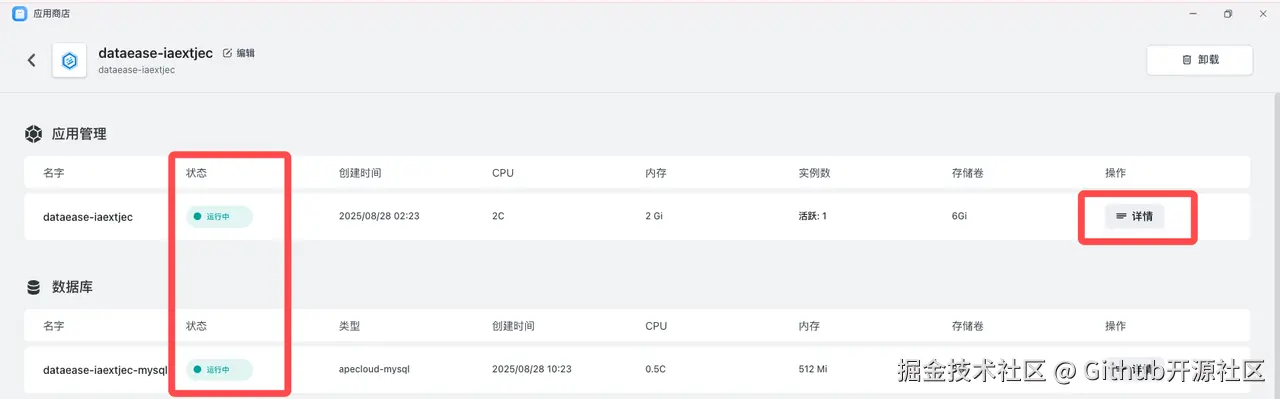 - 部署完成后,在 应用管理 中找到 DataEase,等待状态变为 运行中。