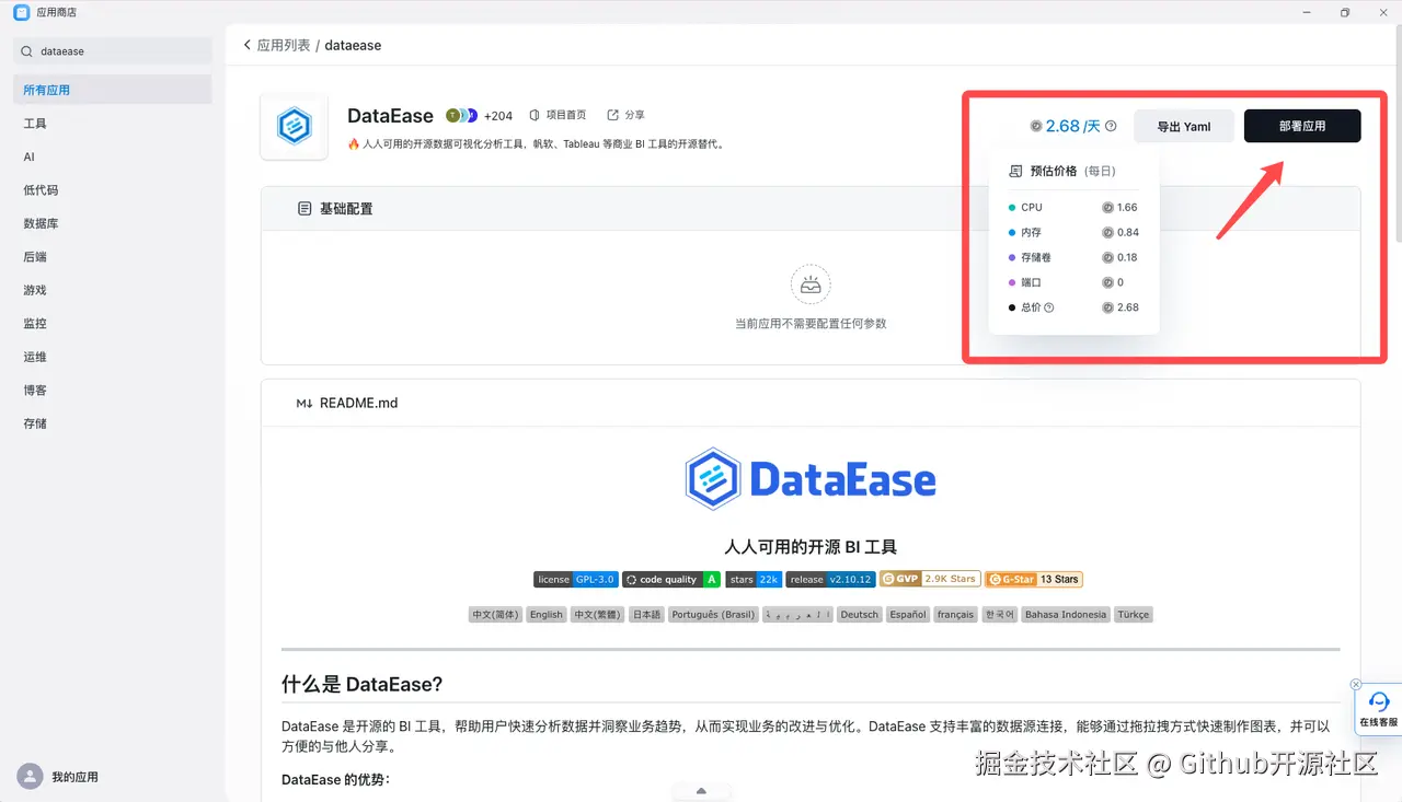 - 点击 DataEase 应用,进入详情页。