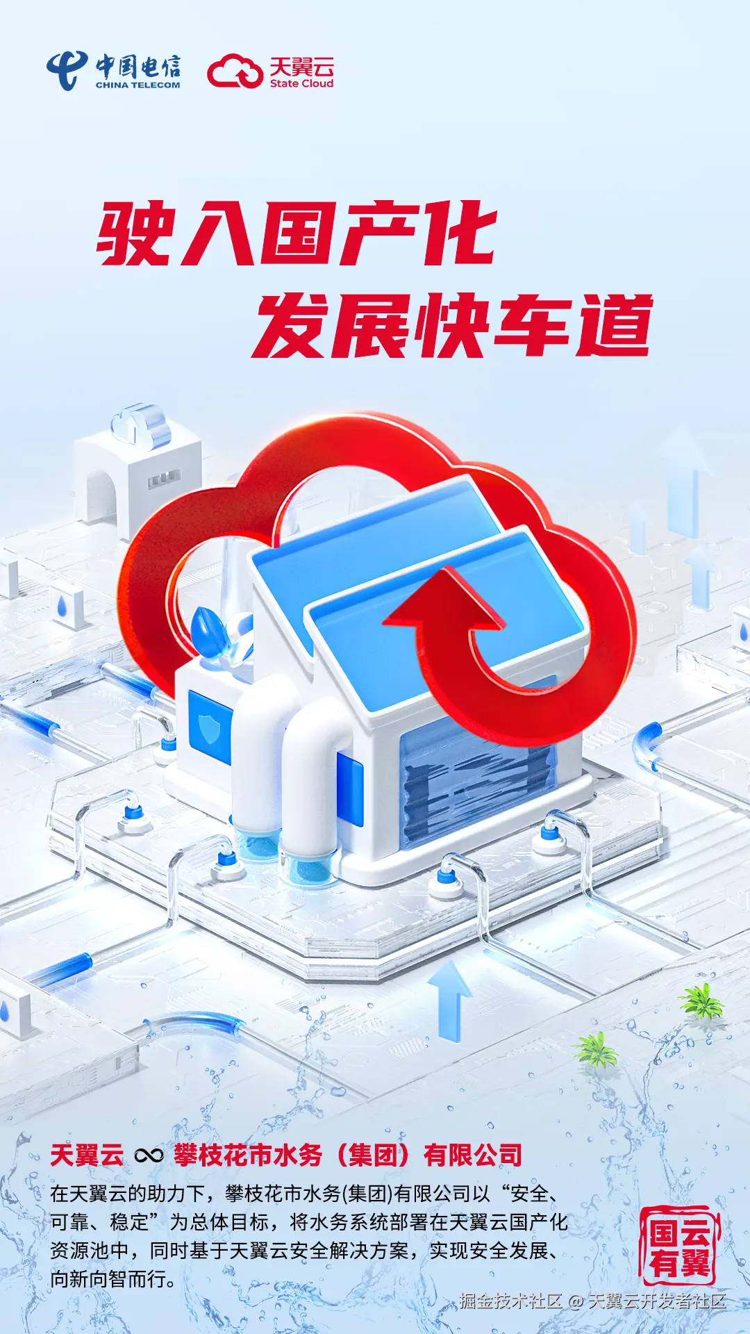针对攀枝花市水务集团的实际所需,天翼云基于丰富的资源池能力及安全防护能力,助力攀枝花市水务集团水务系统上云改造,能够支持业务部署及应用在国产化环境下快速展开,推动攀枝花市水务集团水务管理便捷、高效发展。