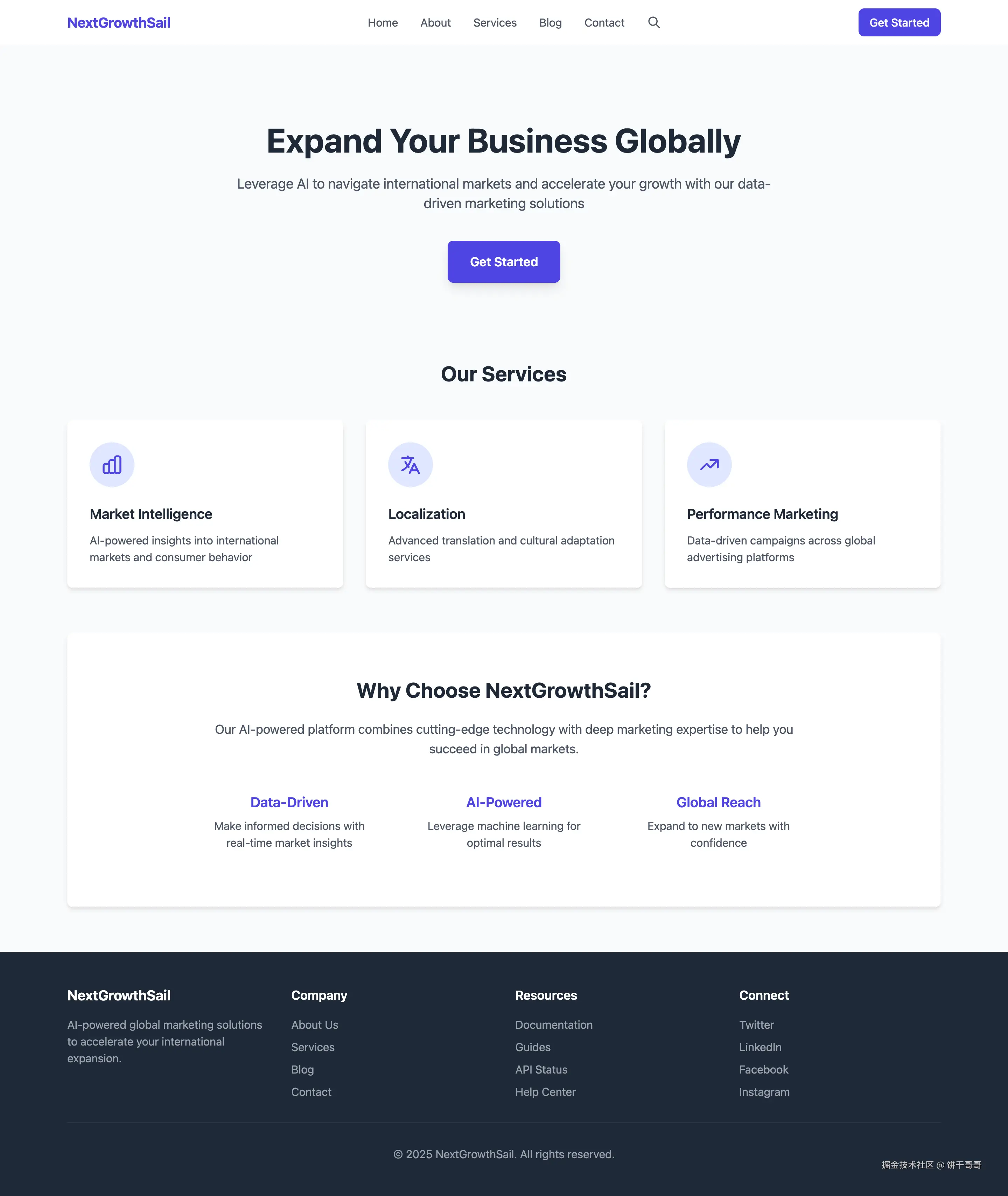 需求起源是我自己的创业公司 NextGrowthSail 需要一个官网。我们是做AI出海营销的,所以官网得像样点,不仅要展示业务、案例,还得有一个独立的Blog模块,用来做内容营销,吸引谷歌的流量。