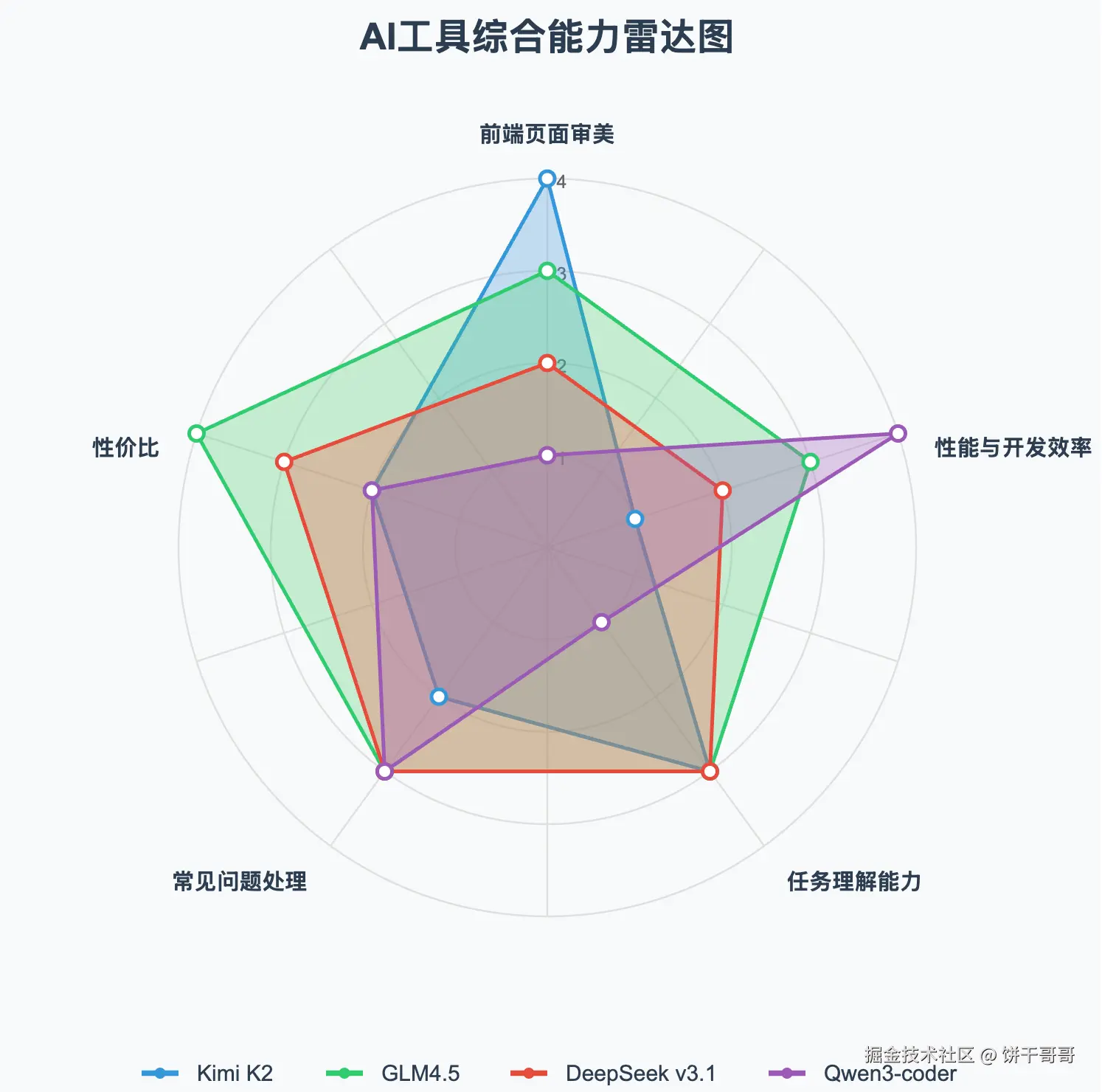 可以看到面积最大的 GLM4.5 无疑是这场测评中的赢家