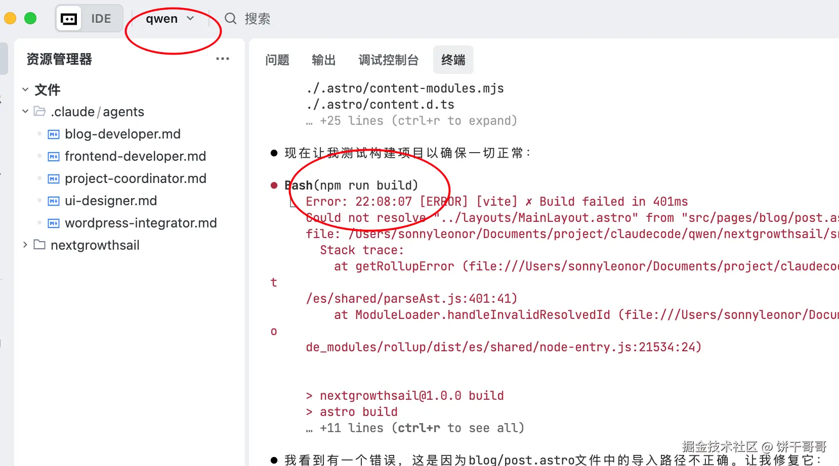 同样是跑完后有小问题,网站打不开,但问题不大,复制报错信息给它自己修复: